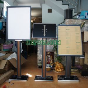 Bảng để cuốn menu giả gỗ sang trọng mặt đứng nghiêng tùy vào mình điều chỉnh độ nghiêng phía sau Bảng chỉ dẫn tòa nhà Chân đế bằng dạng chũ nhật chắc chắn, toàn bộ bảng menu nhà hàng điều chỉnh trắng khổ A3 được làm bằng nhôm không lo bị gỉ sét chịu được mưa nắng với thiết kế cực kỳ bắt mắt