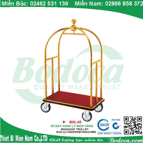 Xe đẩy hành lý mạ vàng nhập khẩu BXL-02 mang nhãn hiệu Bodoca Việt Nam được bảo hành 12 tháng kể từ ngày giao hàng, Công Ty TNHH Thương Mại Sản Xuất Thiết Bị Miền Nam là đơn vị trực tiếp sản xuất và phân phối trên toàn quốc.